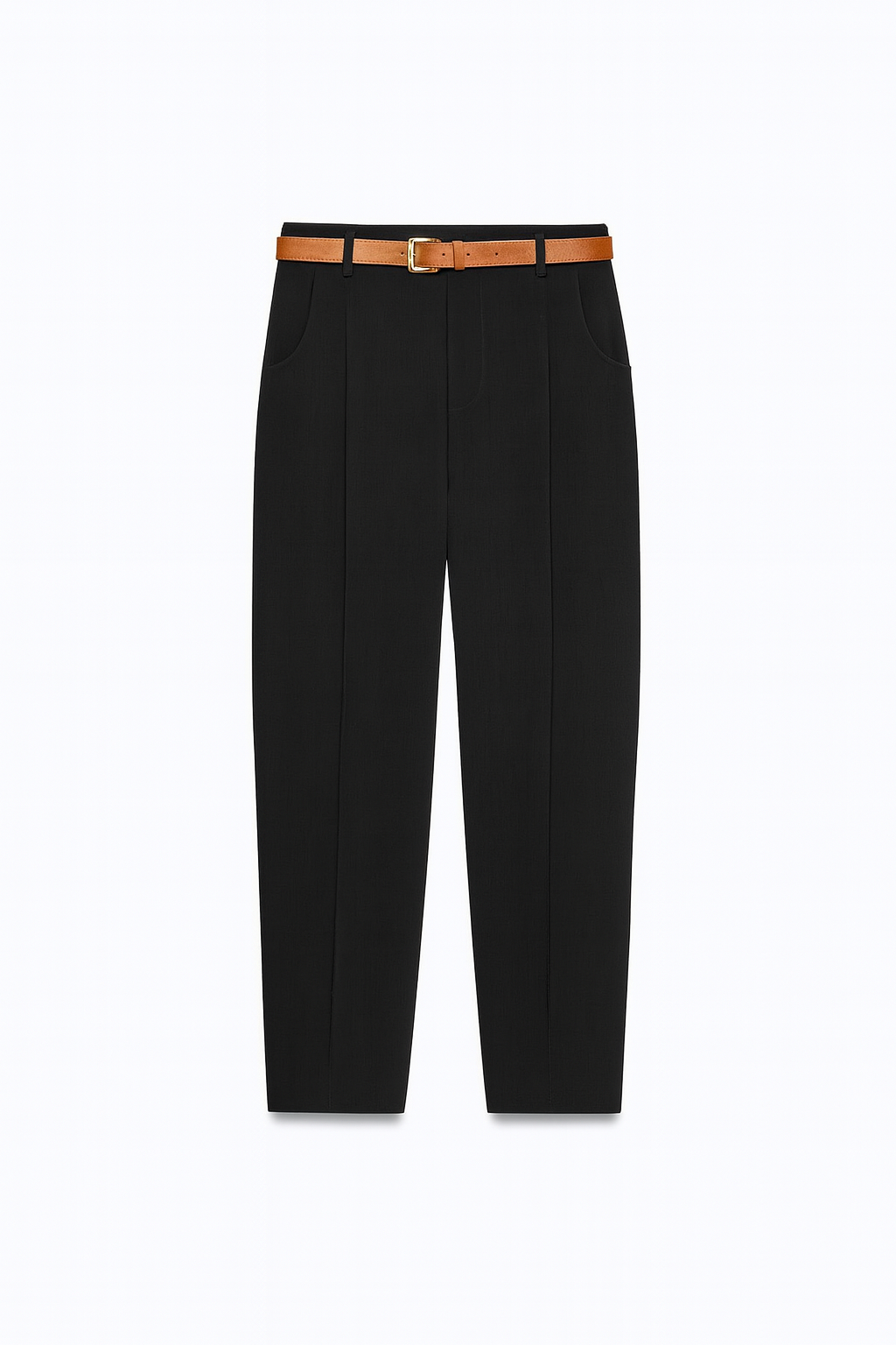 Kadın siyah yüksek bel pensli kamel kemerli klasik pantolon, şık ve zamansız bir tasarıma sahiptir.